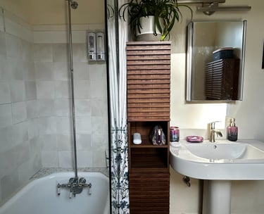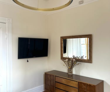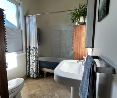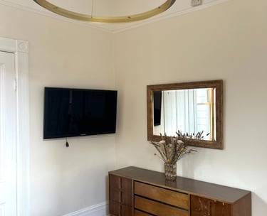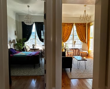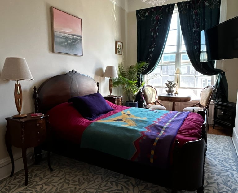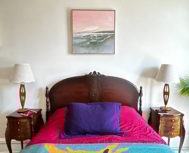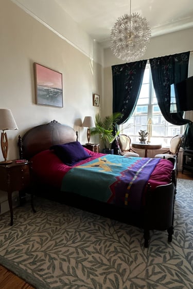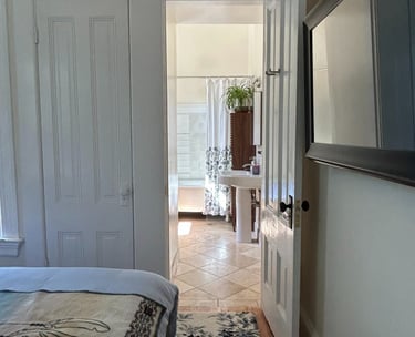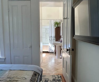 Enjoy a serene stay in our Master Suite with vintage charm, garden view, queen bed, smart television, fireplace, and private bathroom.